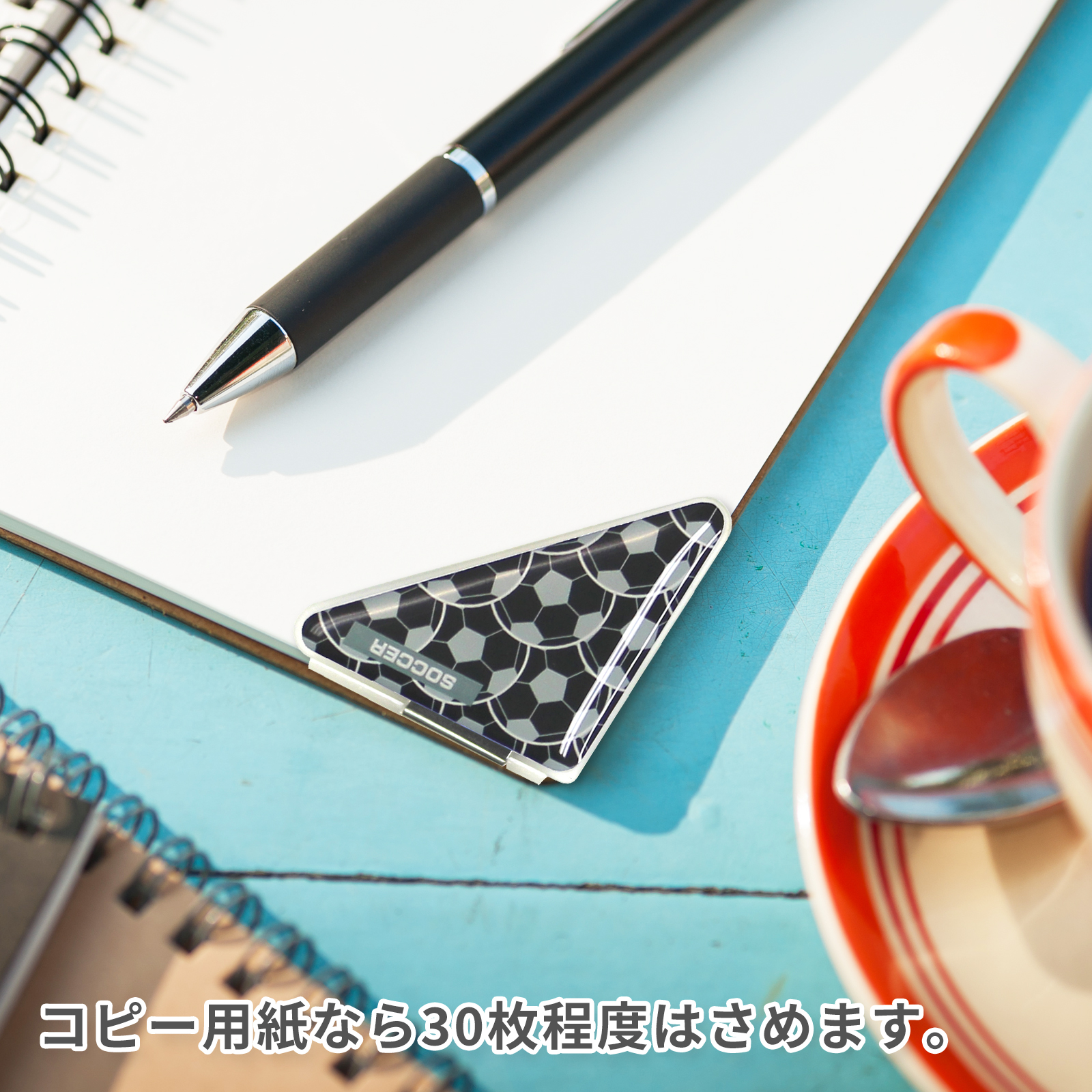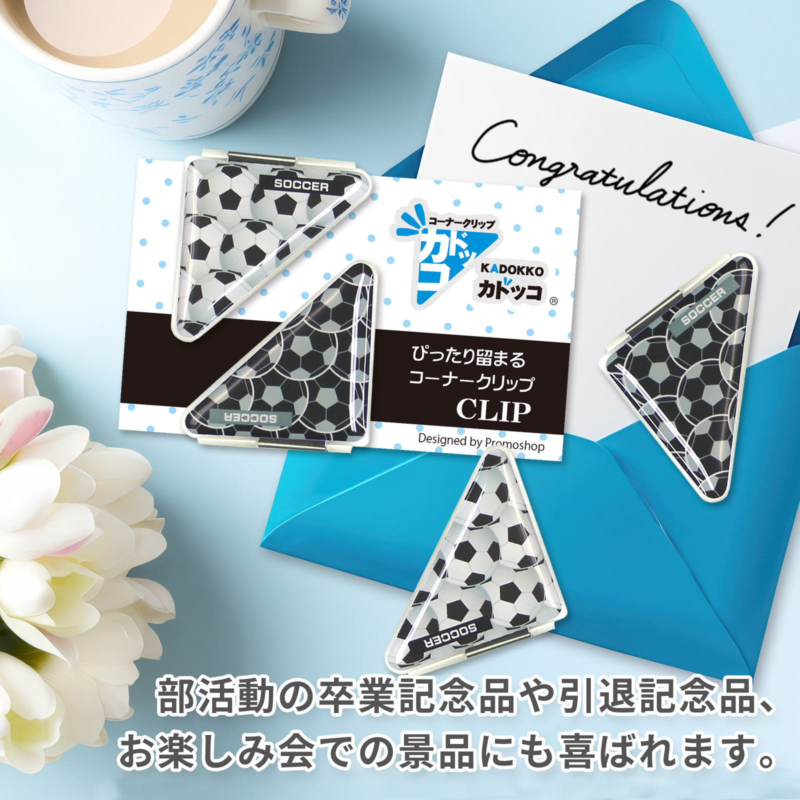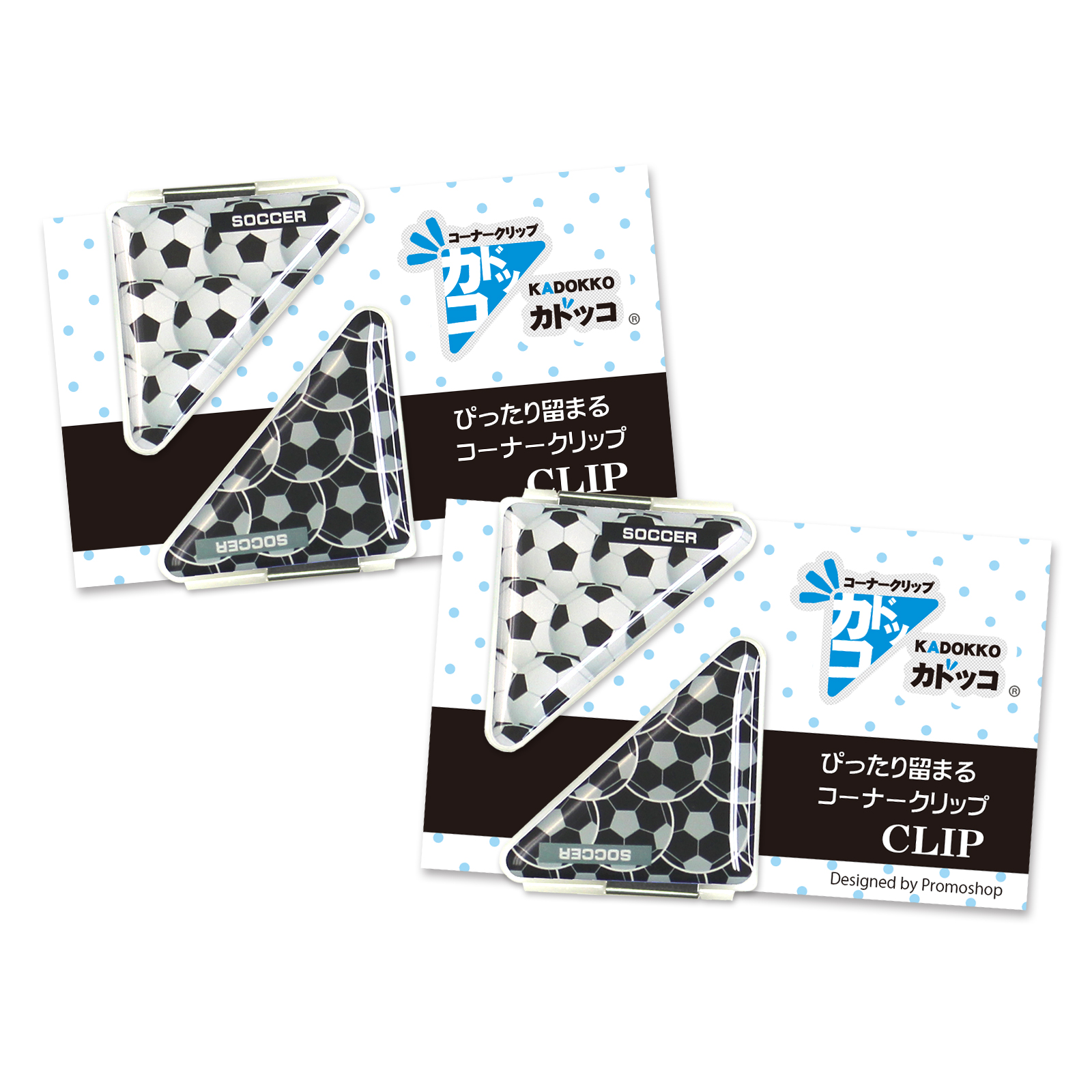 サッカーボール柄のカドッコクリップ2個×2セット!サッカー関連の文房具、文具、事務用品をお探しの方におすすめ!卒業記念品や贈り物にも喜ばれております。