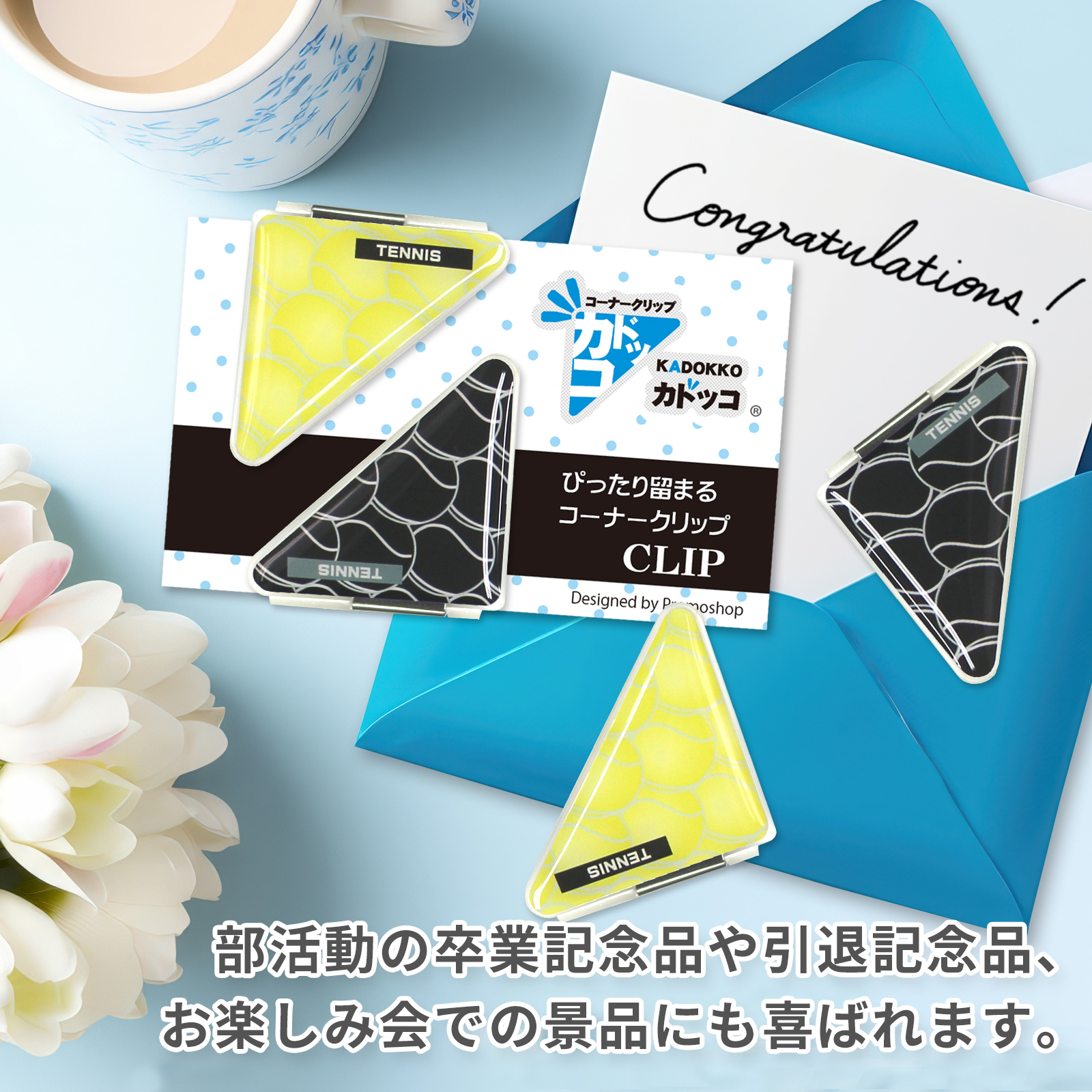 テニスボール柄(小)のカドッコクリップ2個×2セット!テニス関連の文房具、文具、事務用品をお探しの方におすすめ!卒業記念品や贈り物にも喜ばれております。