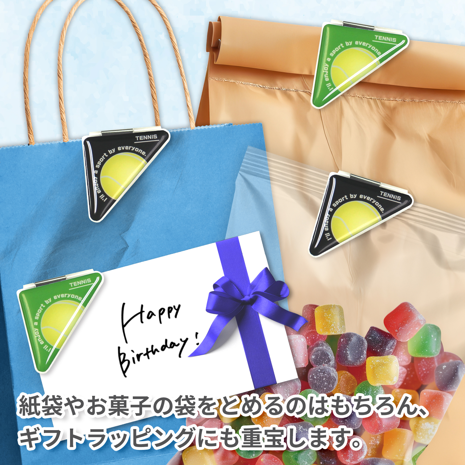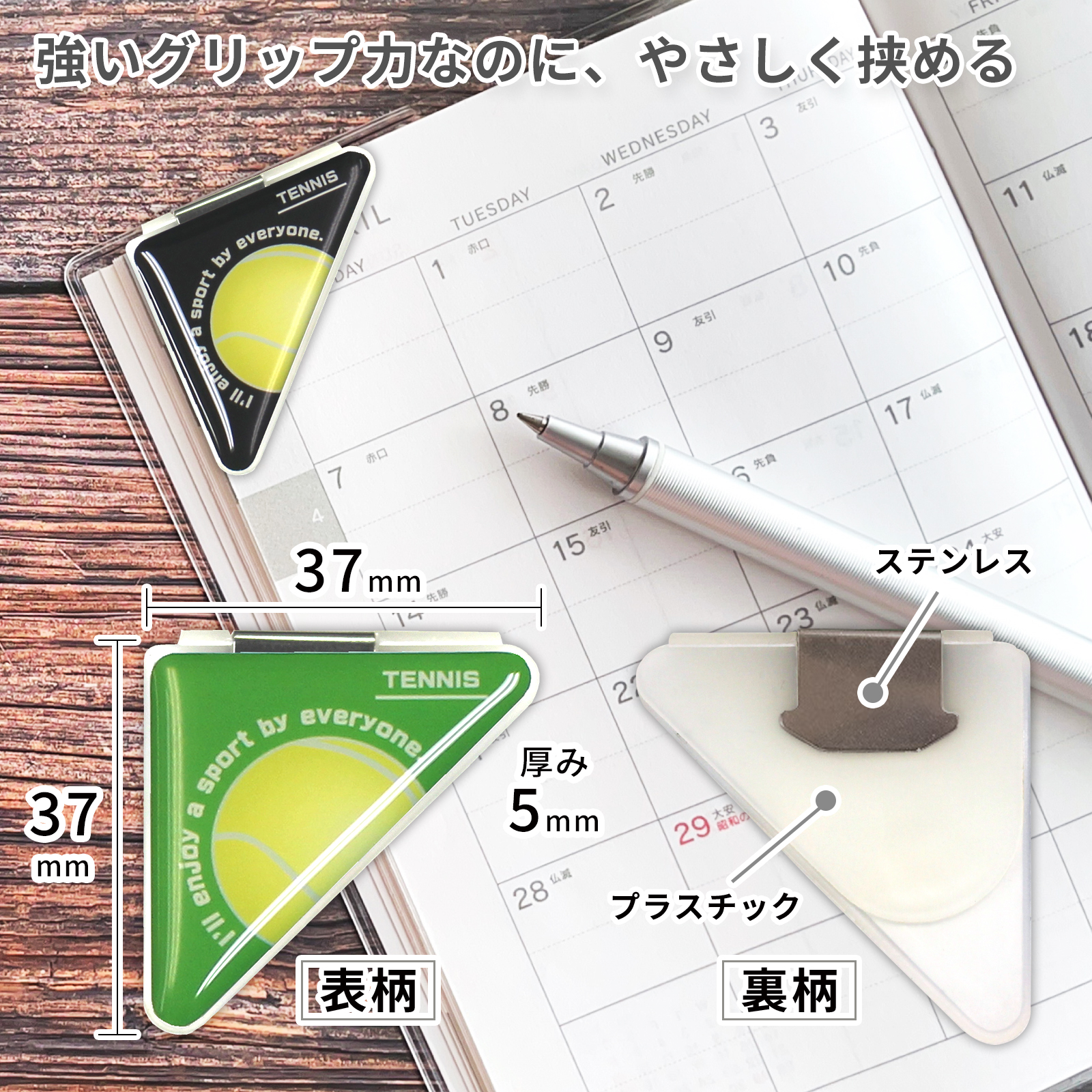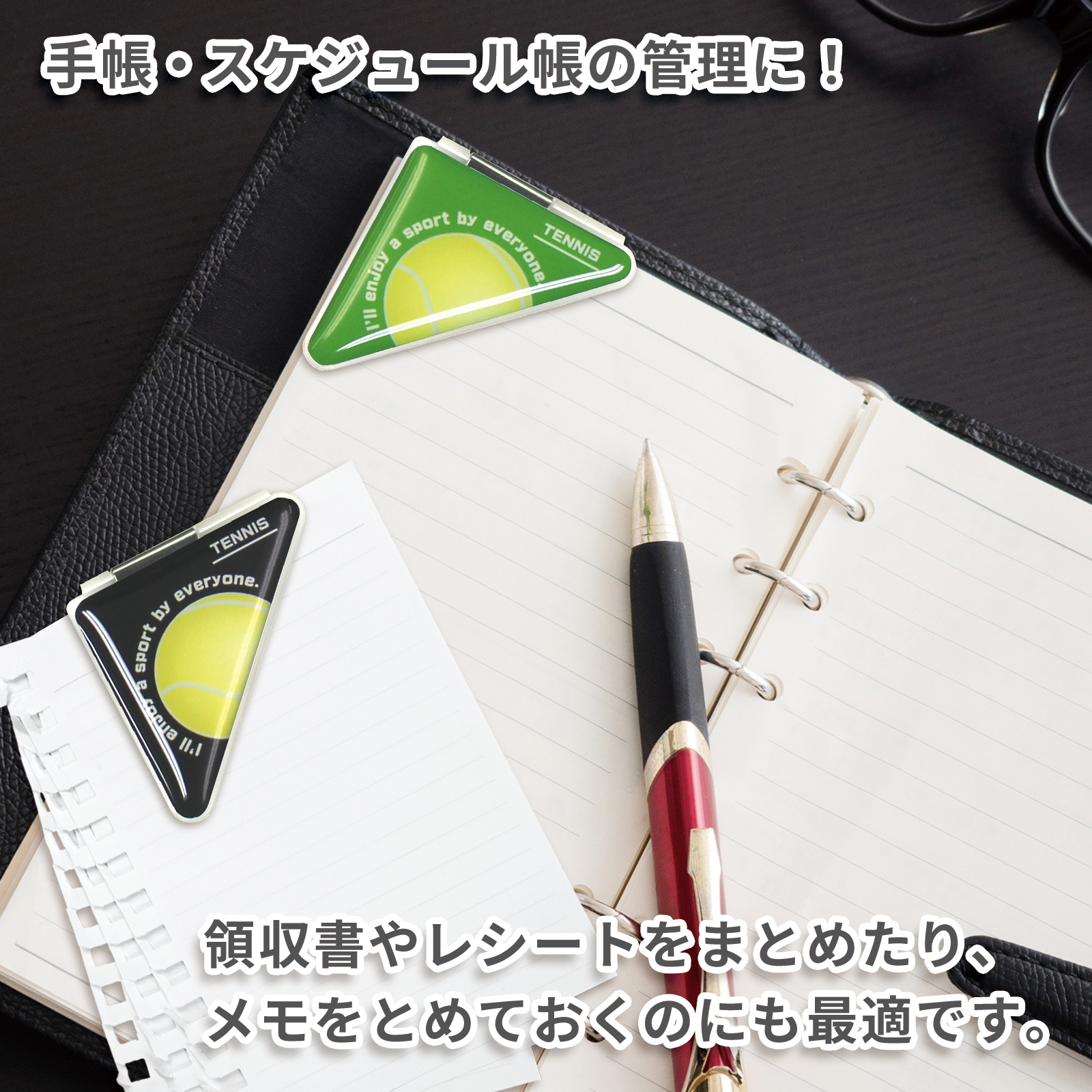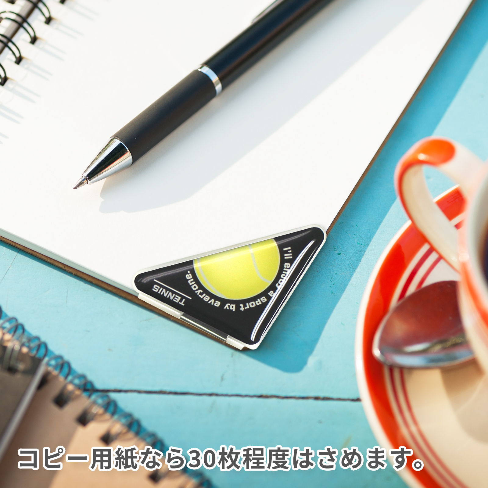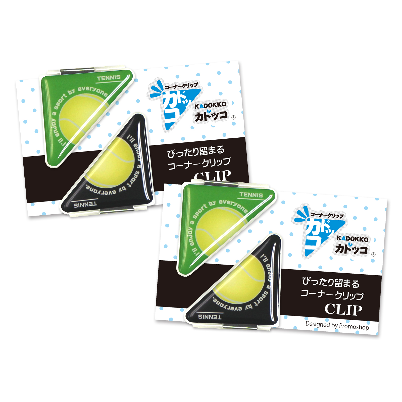 テニスボール柄(大)のカドッコクリップ2個×2セット!テニス関連の文房具、文具、事務用品をお探しの方におすすめ!卒業記念品や贈り物にも喜ばれております。