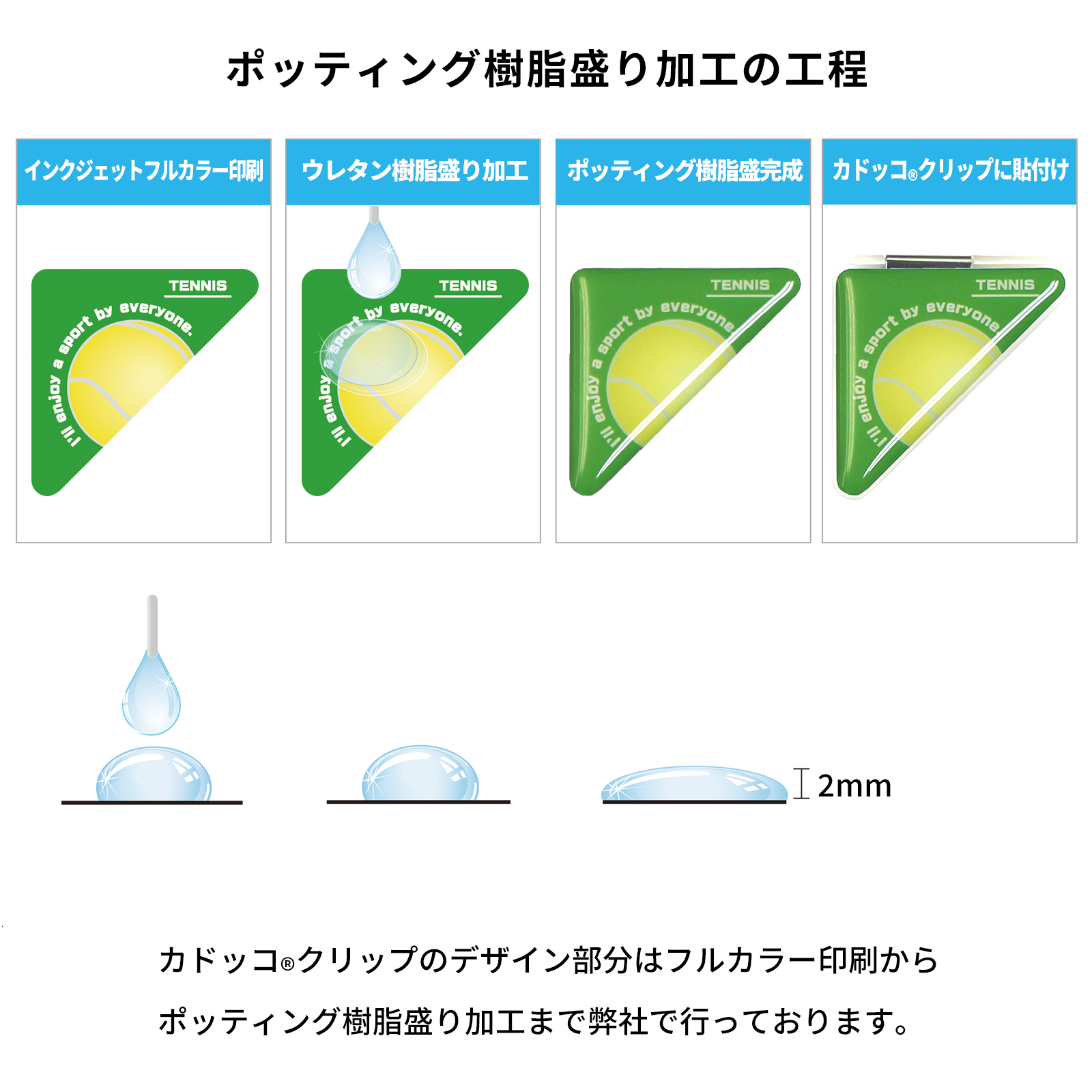 「ポッティング樹脂盛加工」とは、透明なポリウレタン樹脂をシールラベルに塗布し硬化させる加工です。