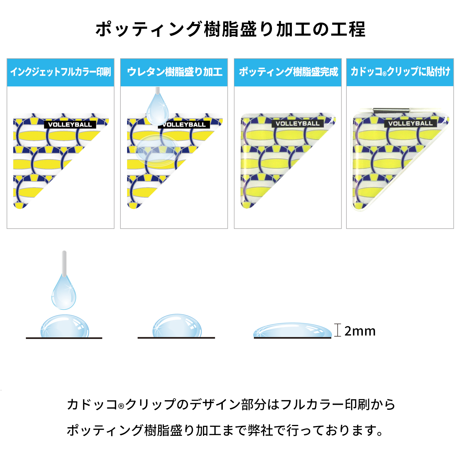 「ポッティング樹脂盛加工」とは、透明なポリウレタン樹脂をシールラベルに塗布し硬化させる加工です。